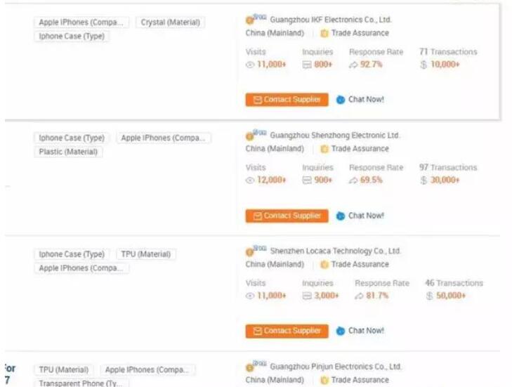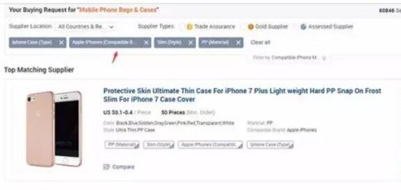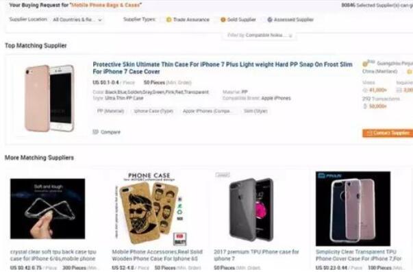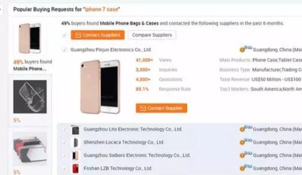 搜索關(guān)鍵詞如iphone 7 case,Ctrl+End定位到頁面最下面Popular Buying Requests for “iphone 7 case”版塊,點擊一家供應(yīng)商打開