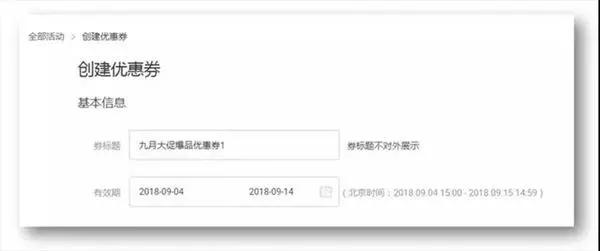 點(diǎn)擊創(chuàng)建優(yōu)惠券,這里填寫優(yōu)惠券標(biāo)題、有效期、面額、數(shù)量、適用商品、適用人群等,創(chuàng)建完成后該優(yōu)惠券就會(huì)在設(shè)置的時(shí)間生效啦。這里可以把自己正在重點(diǎn)打的爆品放到優(yōu)惠券的適用商品里,迅速提升曝點(diǎn)返。