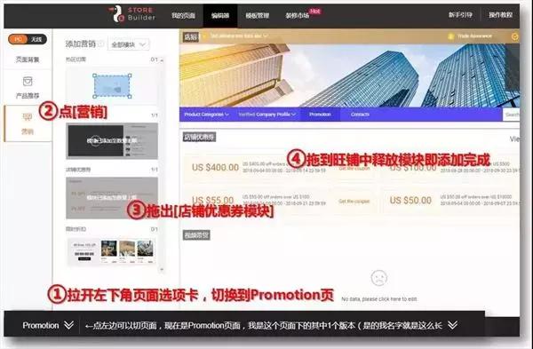 Step3:進(jìn)入旺鋪2.0裝修后臺(tái)>Promotion頁,添加優(yōu)惠券模塊