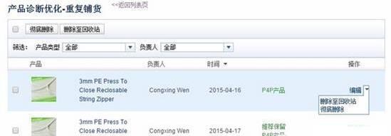 優(yōu)化思路:在產(chǎn)品診斷優(yōu)化中找到重復(fù)鋪貨的產(chǎn)品,如下圖,可以直接刪除產(chǎn)品,或者點(diǎn)擊編輯,進(jìn)入產(chǎn)品的編輯頁,對產(chǎn)品標(biāo)題、關(guān)鍵詞重新修改優(yōu)化即可。