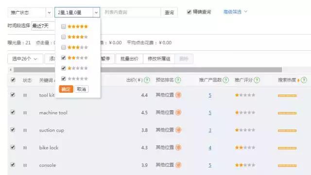 3、推廣星級匹配:低于三星的推廣詞重新添加對應(yīng)的產(chǎn)品進(jìn)行匹配推廣;建議用低星級的推廣詞直接發(fā)布對應(yīng)的產(chǎn)品加入推廣,星級提升了再開啟推廣競價(jià)
