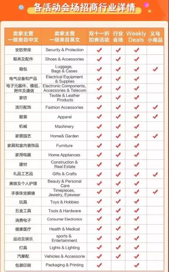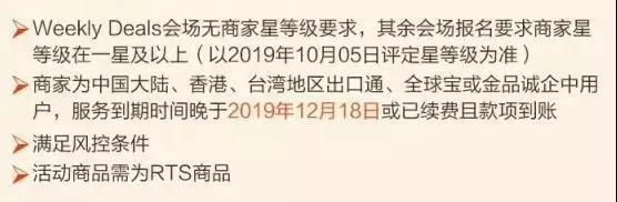 對于招商報(bào)名門檻,參加活動(dòng)商品需是滿足風(fēng)控條件的RTS商品,其中Weekly Deals會(huì)場無商家星等級要求,其余會(huì)場報(bào)名要求商家星等級在一星以上。并且參與此次雙11活動(dòng)的所有商家為中國大陸、香港臺(tái)灣地區(qū)出口通、全球?qū)毣蚪鹌氛\企中用戶。