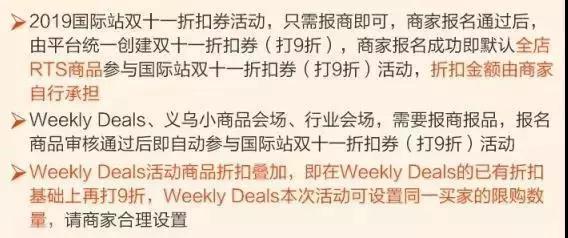 在招商說明方面,活動(dòng)中的Weekly deals、義烏小商品會(huì)場與行業(yè)會(huì)場需要報(bào)商報(bào)品,報(bào)名商品審核通過后即自動(dòng)參與國際站雙十一折扣券(打9折)活動(dòng)。而且Weekly deals活動(dòng)商品可折扣疊加,即在weekly deals的已有折扣基礎(chǔ)上再打9折。