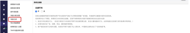 系統(tǒng)會(huì)根據(jù)發(fā)件人、主題、詢盤內(nèi)容等綜合信息進(jìn)行判斷識(shí)別,自動(dòng)過濾帶有特殊的敏感字眼、廣告行為等的詢盤,您可以在【My Alibaba左側(cè)菜單——商機(jī)溝通——設(shè)置——詢盤過濾——系統(tǒng)過濾器】頁面開啟或關(guān)閉該功能
