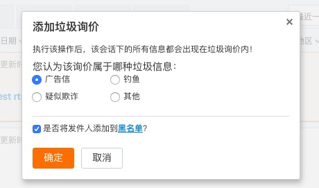 商機(jī)列表頁及商機(jī)詳情頁均有添加垃圾詢價(jià)入口,選擇對(duì)應(yīng)的類型舉報(bào)即可,同時(shí)可以選擇是否將該收件人加入黑名單