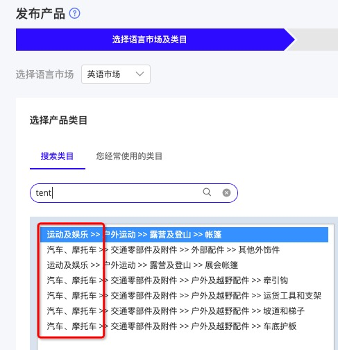 2)用帳篷的英文詞tent搜索,查看下方list的一級類目