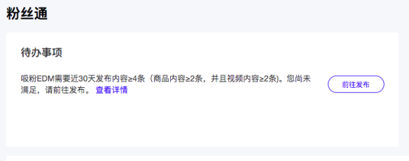 1)近30天內(nèi)(由于數(shù)據(jù)統(tǒng)計(jì)滯后,近2天的不算)是否有4條手動(dòng)發(fā)布內(nèi)容(至少2條視頻內(nèi)容和2條商品內(nèi)容),支撐一個(gè)吸粉EDM,如果沒有,指導(dǎo)商家去發(fā)布內(nèi)容。 (新發(fā)的內(nèi)容,要2天后才能同步識別)