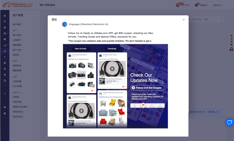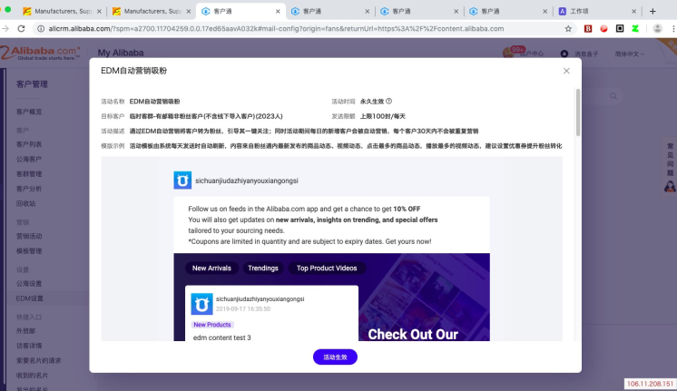 2.滿足條件的商家,會直接跳轉(zhuǎn)到客戶通界面,如果已經(jīng)配置好EDM門檻,則預(yù)覽吸粉EDM界面,點(diǎn)擊按鈕“活動(dòng)生效”即開始自動(dòng)觸發(fā)郵件。每日額度100封,每日自動(dòng)續(xù)發(fā),活動(dòng)取消后續(xù)發(fā)停止。如果沒有配置好EDM門檻,則引導(dǎo)去配置EDM門檻。