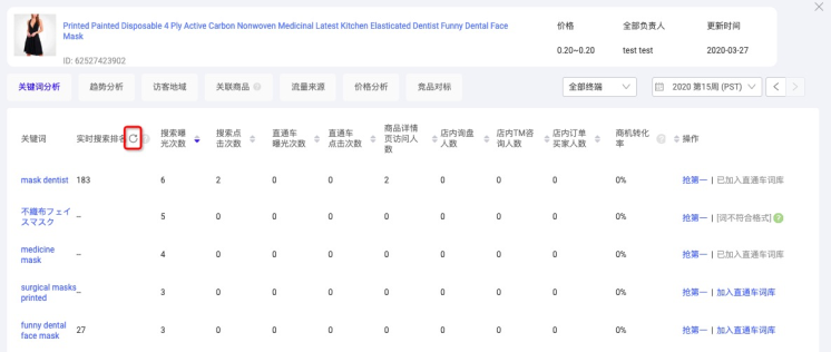 查詢位置:My alibaba-數(shù)據(jù)管家行業(yè)版-產(chǎn)品分析-任選一個產(chǎn)品的產(chǎn)品360-關(guān)鍵詞分析-實(shí)時(shí)搜索排名(右側(cè)刷新按鈕,如下紅框)