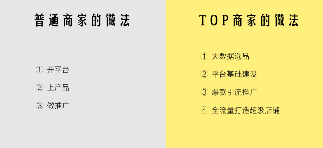 傳統(tǒng)的TOP10打造并沒有大數(shù)據(jù)選品這項,但是,如果現(xiàn)在仍沿用傳統(tǒng)的方式直接開平臺上產(chǎn)品做推廣就想做好平臺,那這個過程一定不會太容易;所以,現(xiàn)在想要做好國際站,我們一定要從大數(shù)據(jù)選品、平臺基礎(chǔ)建設(shè)、爆款引流推廣、全流量打造超級店鋪四大方面進行入手。