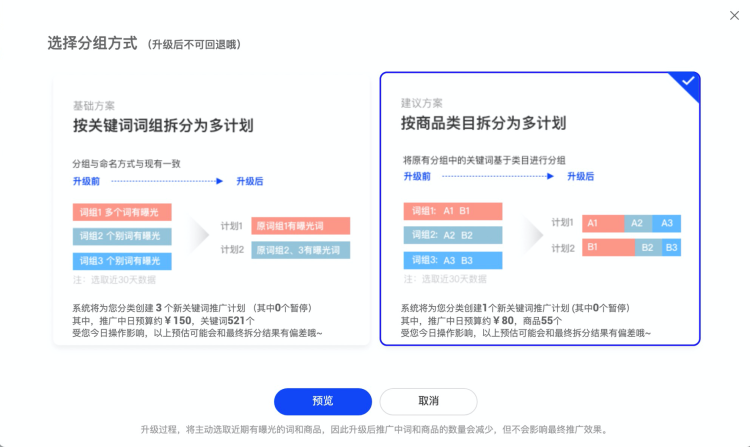 6、關(guān)鍵詞升級時,可分拆計劃進行推廣;(目前正逐步灰度升級中,敬請期待)