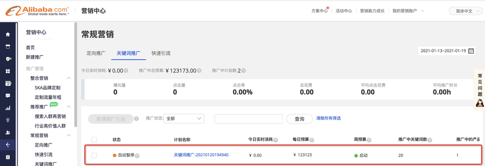 完成升級后,點擊導(dǎo)航【關(guān)鍵詞推廣】,即可看到當(dāng)前的計劃列表;