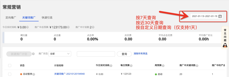 計劃列表中,您可以查看今日該關(guān)鍵詞計劃的實時消耗、推廣中計劃的匯總預(yù)算: