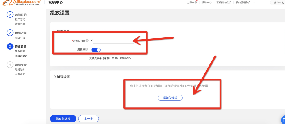 3、設(shè)置計劃日預(yù)算(默認(rèn)為您開啟周預(yù)算,可以點擊關(guān)閉),點擊【添加關(guān)鍵詞】,開始設(shè)置推廣關(guān)鍵詞;