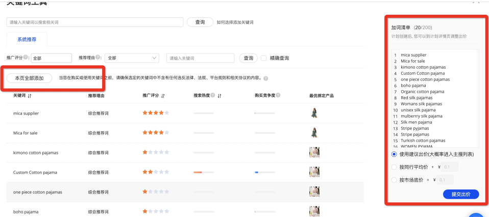 可選擇本頁全部關(guān)鍵詞,完成批量出價