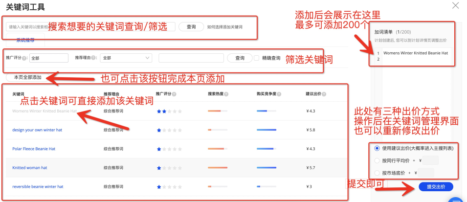 第二步:完成提交出價,即可完成關(guān)鍵詞添加;