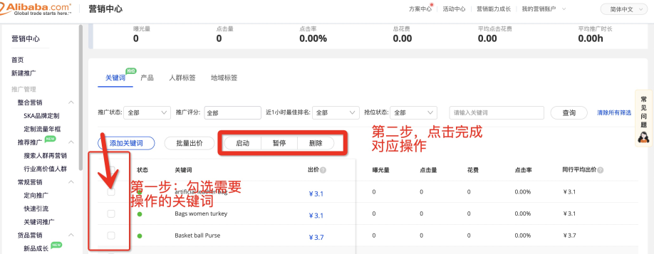 新版關(guān)鍵詞推廣中,詞、品、標(biāo)簽等信息,可分開進行管理,具體操作模塊如下: