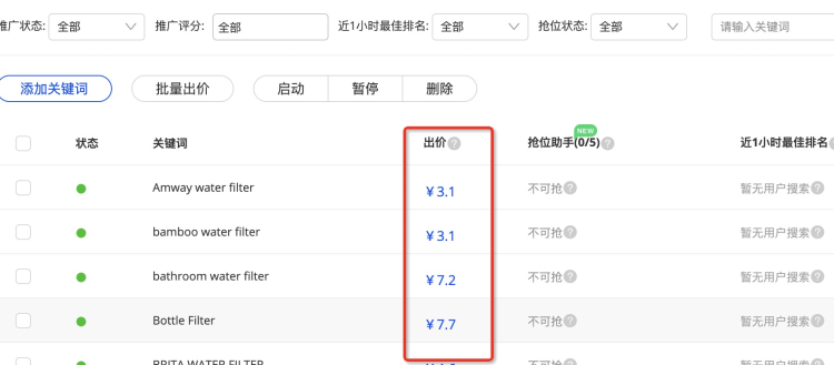 依次展示:關(guān)鍵詞、出價、搶位狀態(tài)、近1小時最佳排名、24小時排名分布、推廣產(chǎn)品數(shù)(該關(guān)鍵詞當(dāng)前關(guān)聯(lián)產(chǎn)品數(shù))、該關(guān)鍵詞推廣評分、該關(guān)鍵詞搜索熱度、購買競爭度、曝光、點擊、詞花費、點擊率、該關(guān)鍵詞同行平均出價;