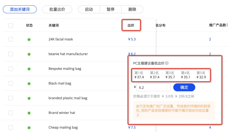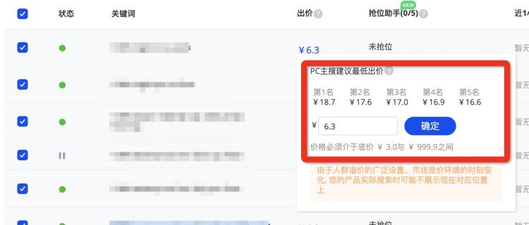 會根據(jù)關(guān)鍵詞當(dāng)前的競爭數(shù)據(jù),給到您進入PC主搜的建議價格,您在當(dāng)前界面設(shè)置完畢價格后,點擊確定即可;