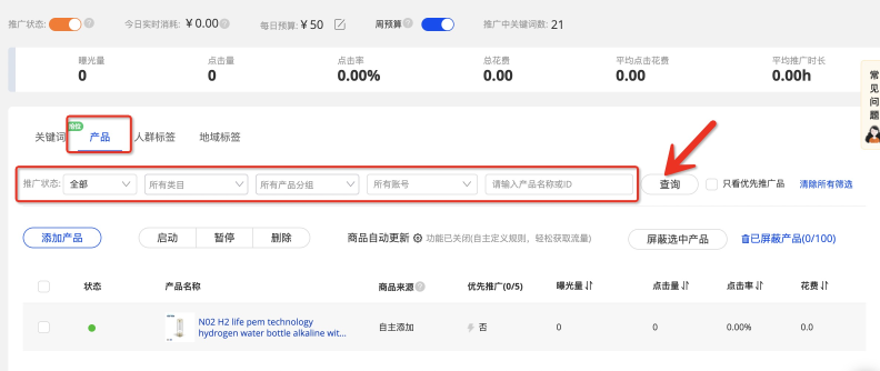 可根據(jù)當(dāng)前商品的推廣狀態(tài)、當(dāng)前商品的發(fā)布類目、您自身針對商品的分組、以及操作人員賬號、或輸入產(chǎn)品名稱或者商品ID,點擊查詢,即可完成計劃商品篩選;商品名稱輸入匹配不分大小寫;