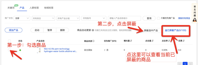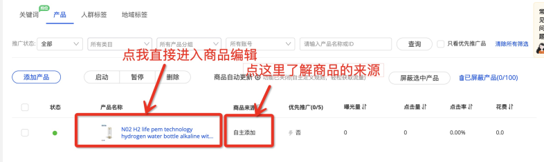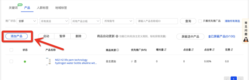 - 您的自主添加商品除非您手動刪除,否則不會因您開啟商品自動更新,而被踢出計劃,不被推廣;(如您自主添加的商品在屏蔽品當(dāng)中,則該產(chǎn)品還是會被推廣、產(chǎn)生花費的哦)