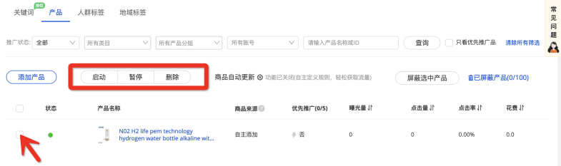 您可以先勾選商品,再點擊啟動、暫?;騽h除,完成批量操作;