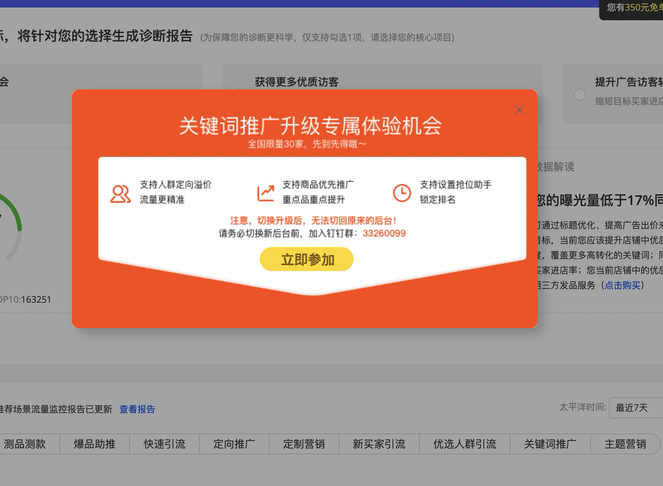 目前僅針對當(dāng)前推廣中的關(guān)鍵詞數(shù)量較少的商家開放內(nèi)測,如您未收到邀請,請您靜靜等待,預(yù)計2月底將逐步開放;