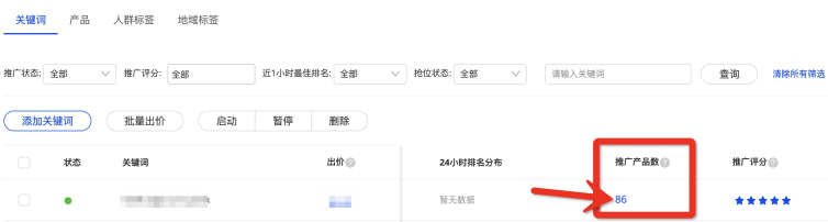 點擊【關(guān)鍵詞】下方,【推廣產(chǎn)品數(shù)】下方的數(shù)字,即可查看當(dāng)前該關(guān)鍵詞所關(guān)聯(lián)的對應(yīng)商品;
