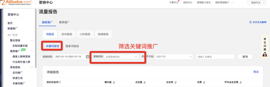(如您找不到關(guān)鍵詞推廣的營銷目標(biāo),也可以通過計劃,篩選關(guān)鍵詞計劃查看數(shù)據(jù);)