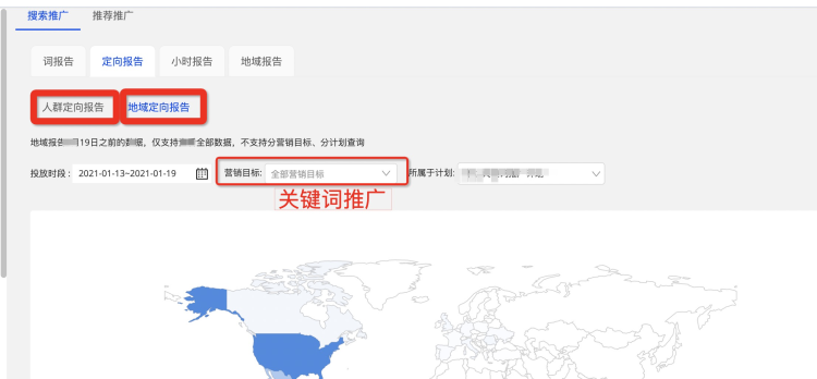 新增數(shù)據(jù)部分:您可以點擊定向報告,篩選關(guān)鍵詞推廣營銷目標(biāo),查看您的人群、地域報告;