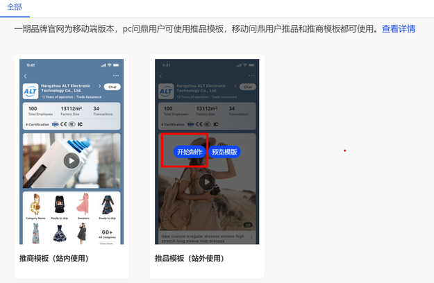 “營(yíng)銷(xiāo)中心-問(wèn)鼎后臺(tái)-品牌官網(wǎng)”點(diǎn)擊創(chuàng)建承接頁(yè),點(diǎn)擊推品模板“開(kāi)始制作”