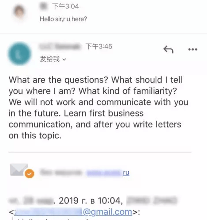 舉個例子,有位外貿(mào)人給我發(fā)了這么一個,問我怎么辦?盯客戶盯的太緊,對方?jīng)]回復(fù),就問了客戶r u here?結(jié)果客戶很反感。