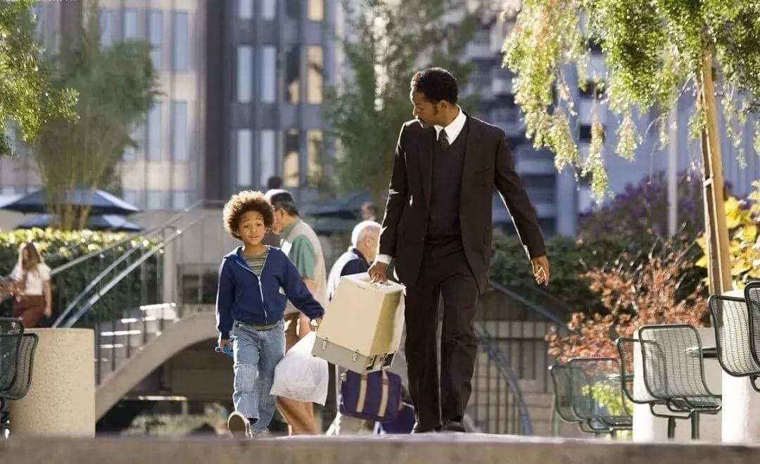 很多人應(yīng)該看過這部電影,男主生活落魄,事業(yè)不順,被妻子拋棄,和兒子相依為命,住過收容所,在公廁過過夜,交不起罰單,被人唾棄。一邊推銷醫(yī)療儀器謀生,一邊抓住股票投資公司實(shí)習(xí)的機(jī)會,每天拼命的打電話給客戶,坐最后一班車回家...