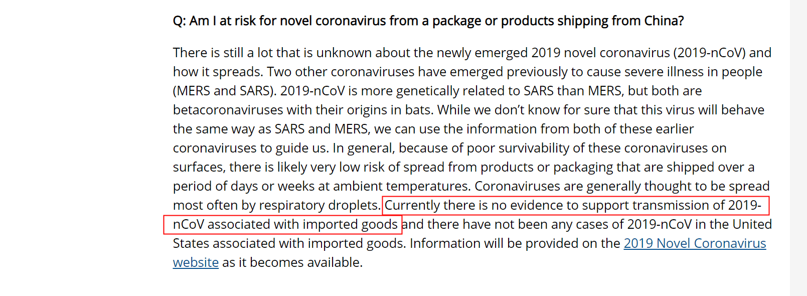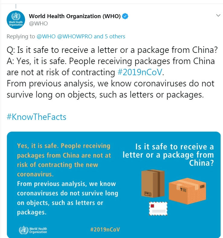 The World Health Organization (WHO) confirmed via Twitter on February 1 that "people receiving packages from China are not at risk of contracting 2019-nCoV" and have drawn from their analyses that the "coronaviruses do not survive long on objects, such as letters or packages". The United States Centers for Disease Control and Prevention (CDC) has also stated that “there is no evidence to support the transmission of 2019-nCoV associated with imported goods.”